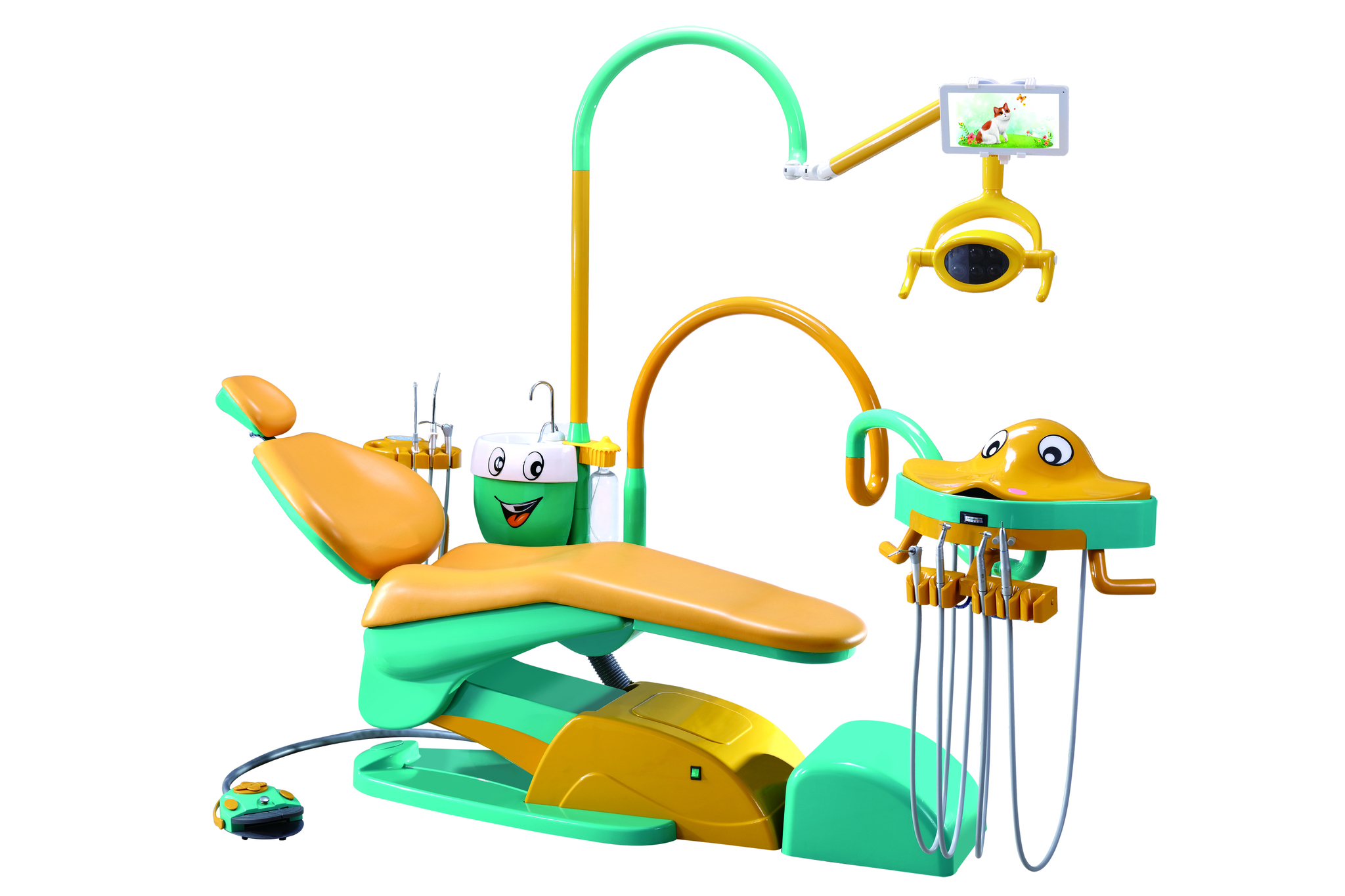 Кресло пациента в стоматологической установке Valencia 03 выполнено в ярких, приятных цветах. Во время процедуры ребенок чувствует себя комфортнее и увереннее, чем в строгом классическом варианте кресла. В числе остальных особенностей данного электромеханического кресла с анатомической конфигурацией наличие:
